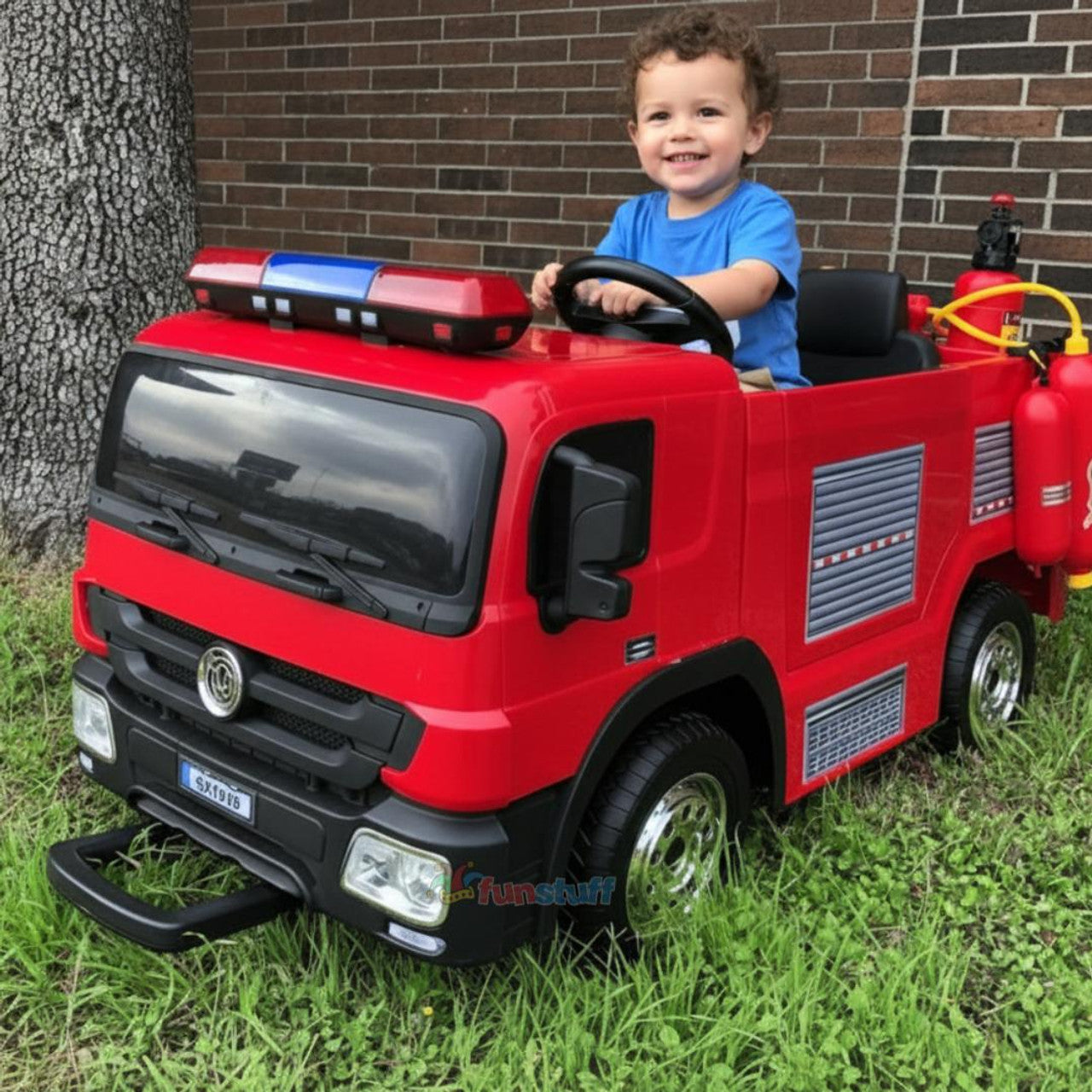 The helmet, backpack and toy extinguisher are included for your Fire Engine 12V Electric Ride On Truck Red. There's even a 2.4G parental remote control so any larger would be firefighters can have a go at driving even if they can't get behind the wheel. I'm not sure the helmet will fit though!
